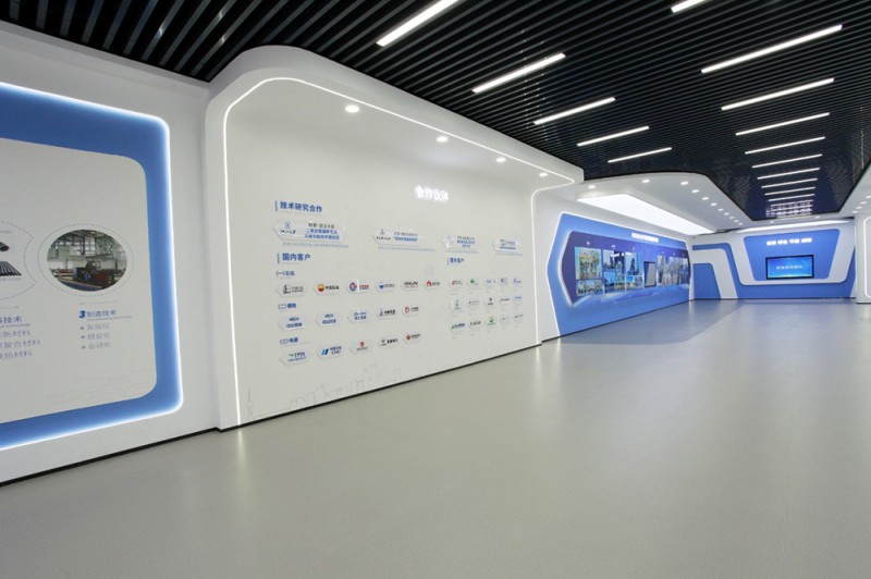 頂和地面造型統(tǒng)一,白色吊頂和灰色橡膠地面,黑色方鋼吊頂和灰色橡膠地面相互呼應(yīng),統(tǒng)一中富有變化,變化中又蘊(yùn)含統(tǒng)一,使整個(gè)展廳科技意境深遠(yuǎn)悠長(zhǎng)。